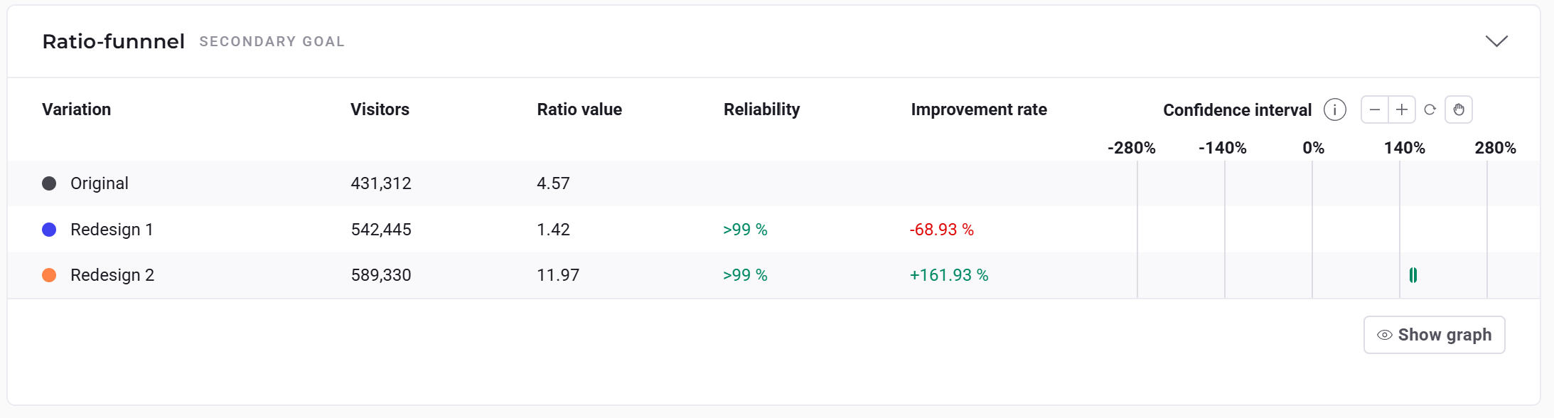 Ratio Metrics are fully integrated into the Results page. They display consistently across tables and charts, whether you are viewing by goal or variation.